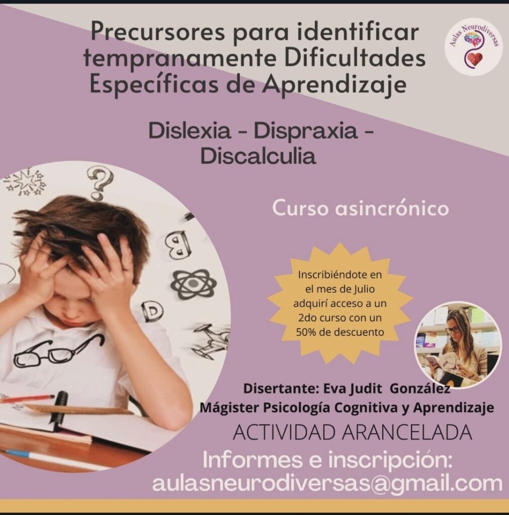 Te invitamos a participar del Curso Online “Precursores para identificar tempranamente Dificultades Específicas de Aprendizaje (Dislexia – Discalculia – Dispraxia)” que se dictará en dos encuentros de dos horas por Zoom